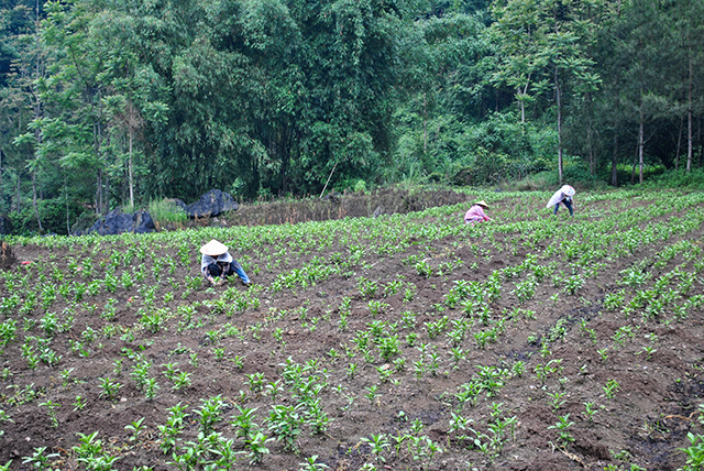据了解,该基地去年起在里湖瑶族乡里湖社区纪后屯、甘河屯和城关镇恩村村种植板蓝根近50亩,今年新种面积有30多亩。基地负责人介绍,板蓝根也叫蓝靛根,既可做药材也可做染料。一般前两三年都是收获枝叶加工成蓝靛膏,用来染布制作民族服饰,本地及贵州方向瑶族群众需求量大,销路无忧。板蓝根比较容易管理,每年可收割鲜枝叶两次,亩产量5000斤左右,目前价格毎斤1到1.2元,亩产值大约5000-6000元,三年后收获根部效益会更好。为保证种植效果,同时带动脱贫群众持续增收,基地目前吸纳了4户脱贫户参与板蓝根及百部、花椒等药材的管护,人工费每年3万元以上。