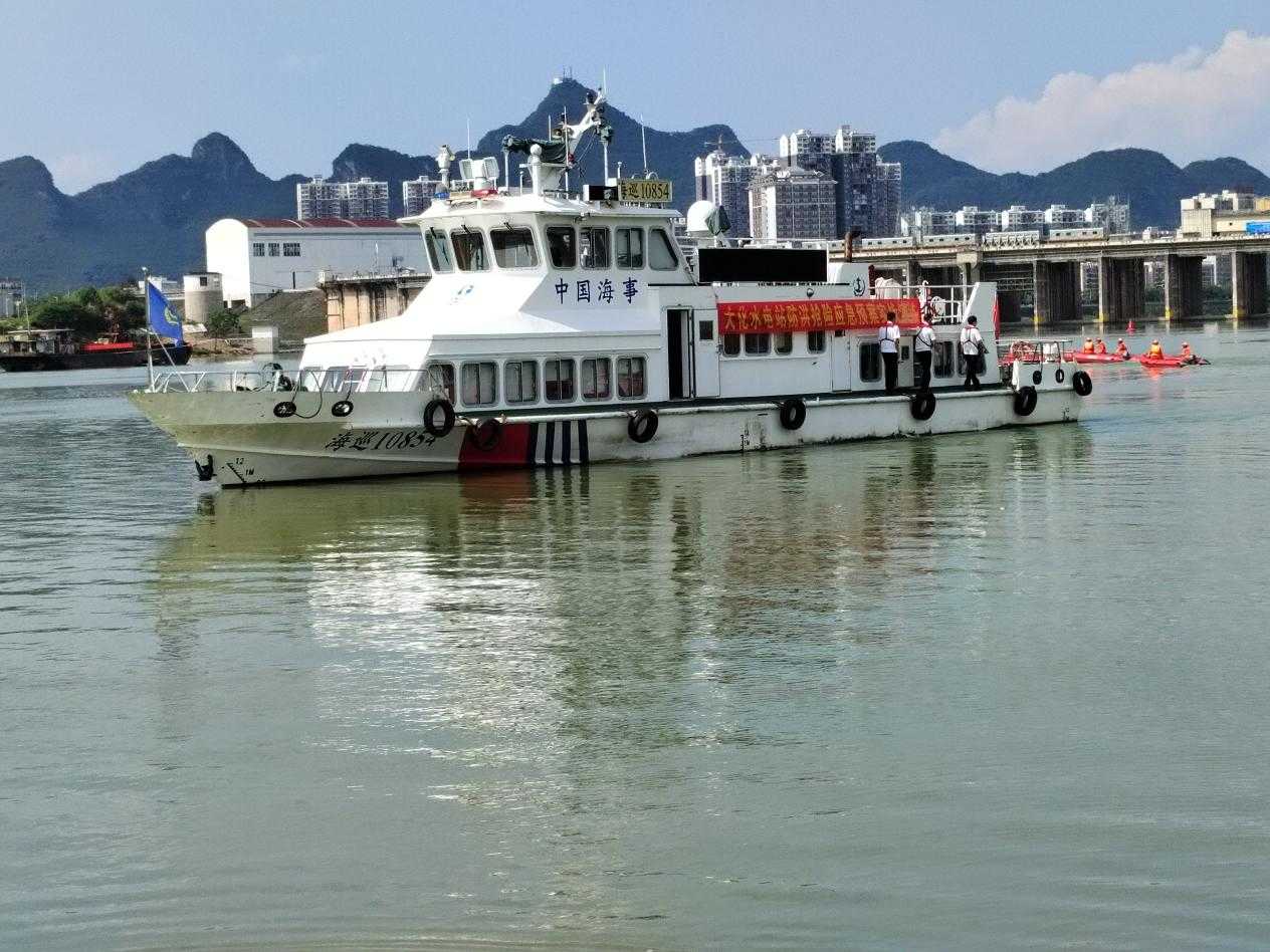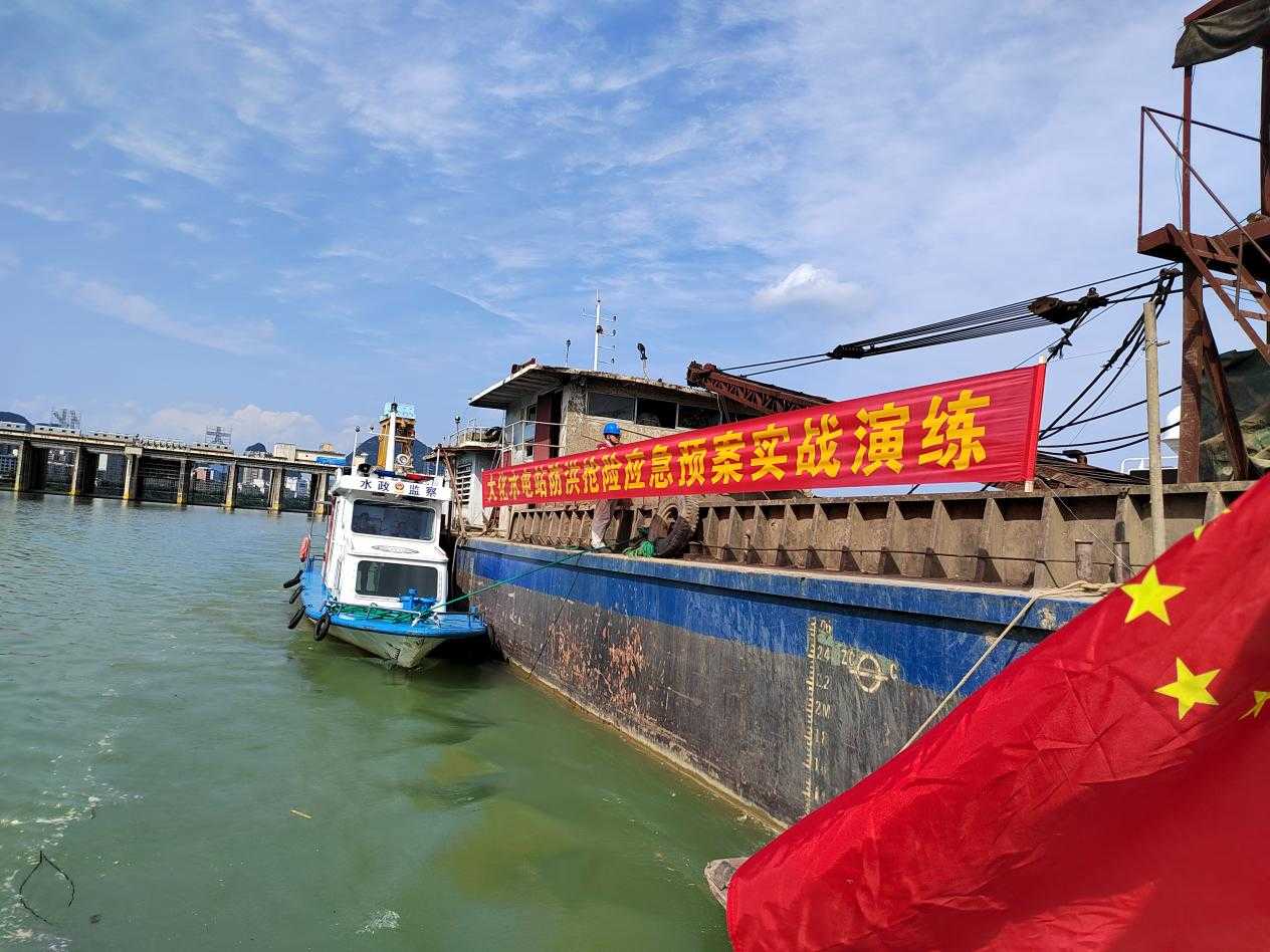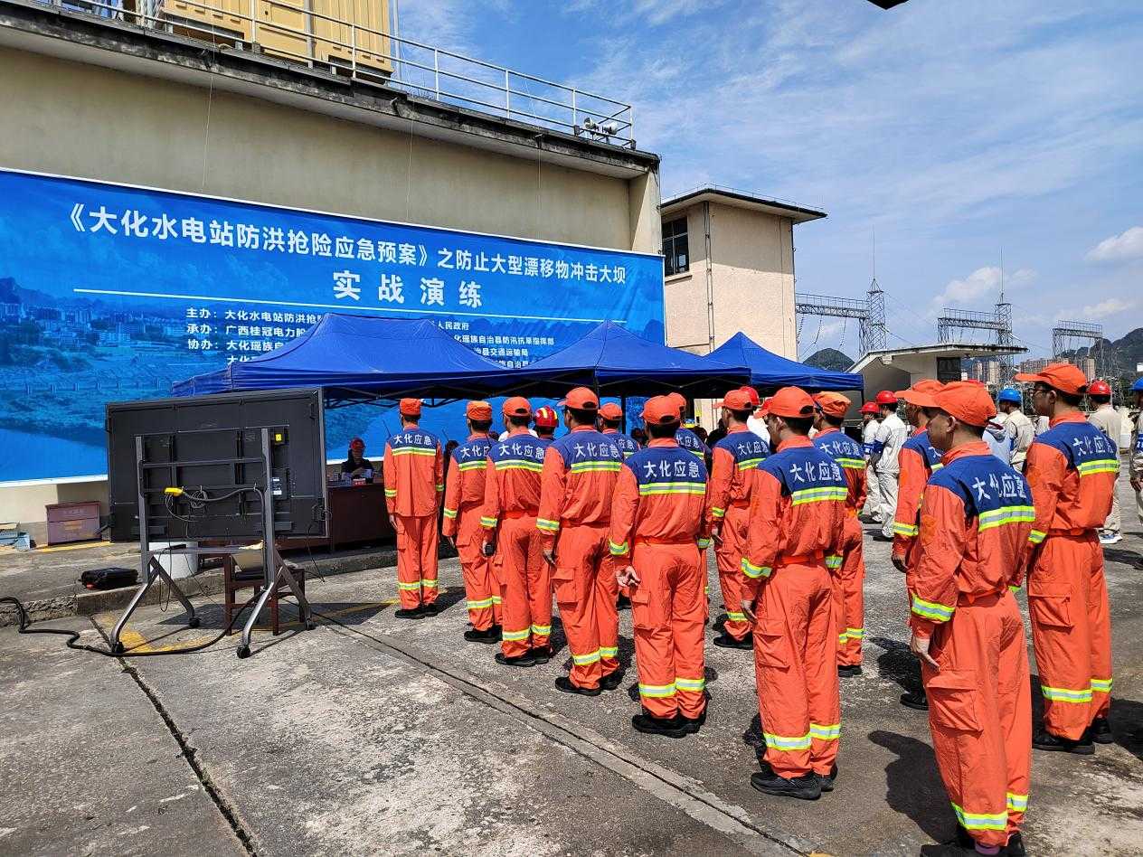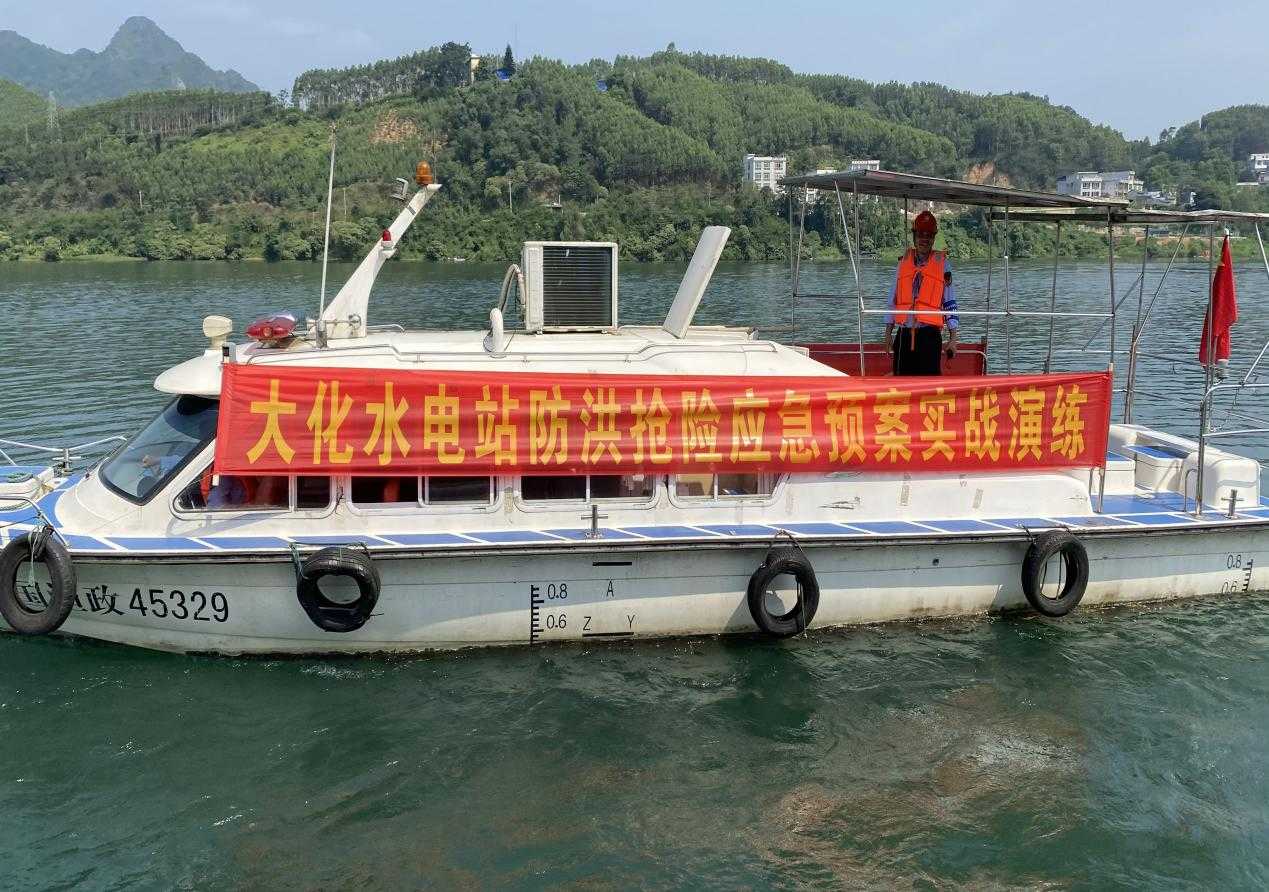 本次演练模拟大化水电站库区持续特大暴雨,区间来水急剧增大,河道水流湍急且夹带大量竹、木,导致部分停靠于河边的大型船只失控,漂向大坝,情势危急,船上有12名船员被困,江面有人员落水,被困船员与落水人员生命安全受到威胁。