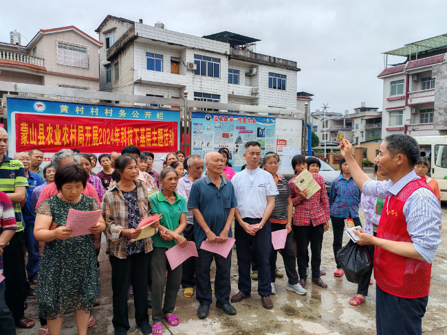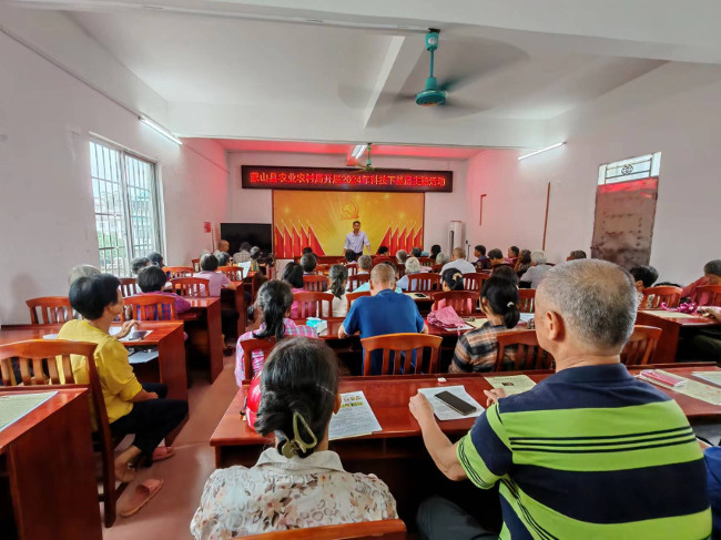 围绕2024年科技活动周精神——“弘扬科学家精神,激发全社会创新能力”,聚焦全面支撑粮食重要农产品稳定安全供给,夯实稳粮扩油。5月29日蒙山县农业农村局在黄村镇黄村村举办了“2024年科技下基层主题活动”,活动主要采用科技送教下乡、进村现场培训的方式举行,培训班上农业技术专家针对水稻、玉米、花生等粮油作物主要病虫害识别、监测与防控技术面对面现场讲解,详细介绍了当前我县粮油作物病虫害发生情况,分析未来发生的趋势,因地制宜提出了科学合理的防治措施,确保我县粮油作物生产安全。本次培训班为粮食生产“两稳两扩两提”(稳面积、稳产量,扩大豆、扩油料,提单产、提自给率)目标任务提供农业技术保障。
