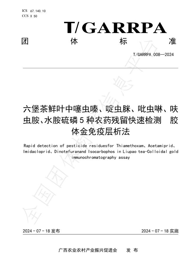 由梧州市农产品质量安全综合检测中心牵头组织制订的《六堡茶鲜叶中噻虫嗪、啶虫脒、吡虫啉、呋虫胺、水胺硫磷5种农药残留快速检测胶体金免疫层析法》(T/GAPARI008-2024)团体标准,经广西农业农村产业振兴促进会批准于2024年7月18日发布并实施。这是广西首个六堡茶鲜叶胶体金农残检测团体标准,该标准检测方法操作简单、检测速度快、灵敏度和特异性较高,适合于茶园基地源头农残监测的现场快速准确检测,可对生产源头的茶鲜叶及时进行安全风险隐患排查,实现对茶叶原料准确及有效监控,这对保障六堡茶产品安全优质及促进广西六堡茶产业的高质量发展具有积极现实意义。