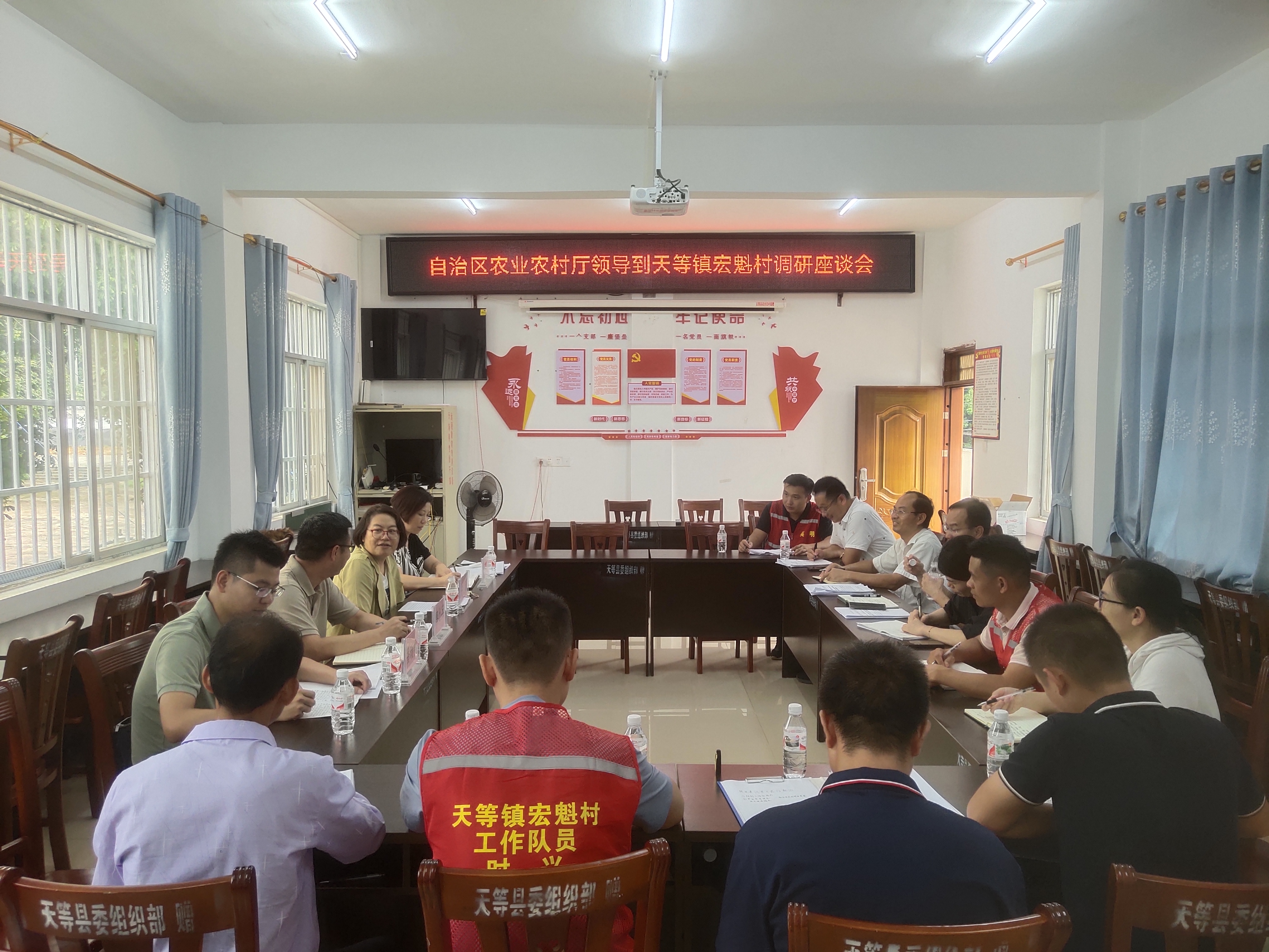 随后,调研组与崇左市农业农村局、天等县农业农村局、天等镇、派驻天等县驻村工作队等相关人员座谈交流,听取派驻天等县驻村工作队和市、县农业农村局工作汇报,并对做好下一步工作提出了要求。一是提高户厕改造质量。要加大户厕改造宣传力度,提高群众参与度和满意度。因地制宜探索本地改厕模式,以规范标准、更高要求确保农村“厕所革命”高质量推进。二是加快推动产业发展。定点帮扶村要落实好村级“十四五”产业规划项目实施,推进桑蚕、渔业、百香果等产业组团式发展;开展村企精准对接,引进一批带动能力强的新型农业经营主体;打造驻村第一书记直播间品牌,助推天等“优品”特色农产品销售。三是加强产业人才培养力度。重点围绕天等县肉牛、辣椒、八角等产业发展需求,整合资源培养一批能够引领一方、带动一群、示范一片的乡村实用人才,带动脱贫群众发展产业增收致富。