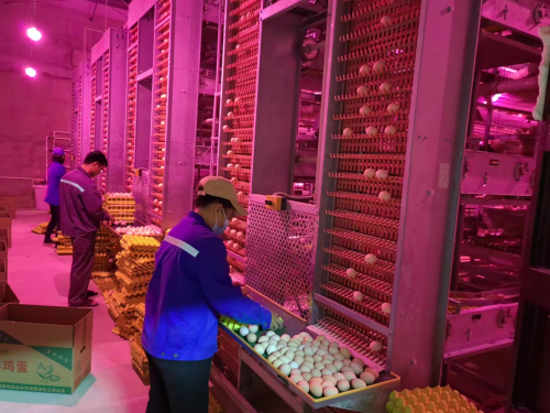 位于广西防城港市港口区光坡镇栏冲村蛋鸡养殖示范基地,鸡舍干净整洁、音乐回荡,一个个鲜鸡蛋随着传输带轻轻滚落在操作平台上,分拣员熟练地拣出放入鸡蛋托盘。