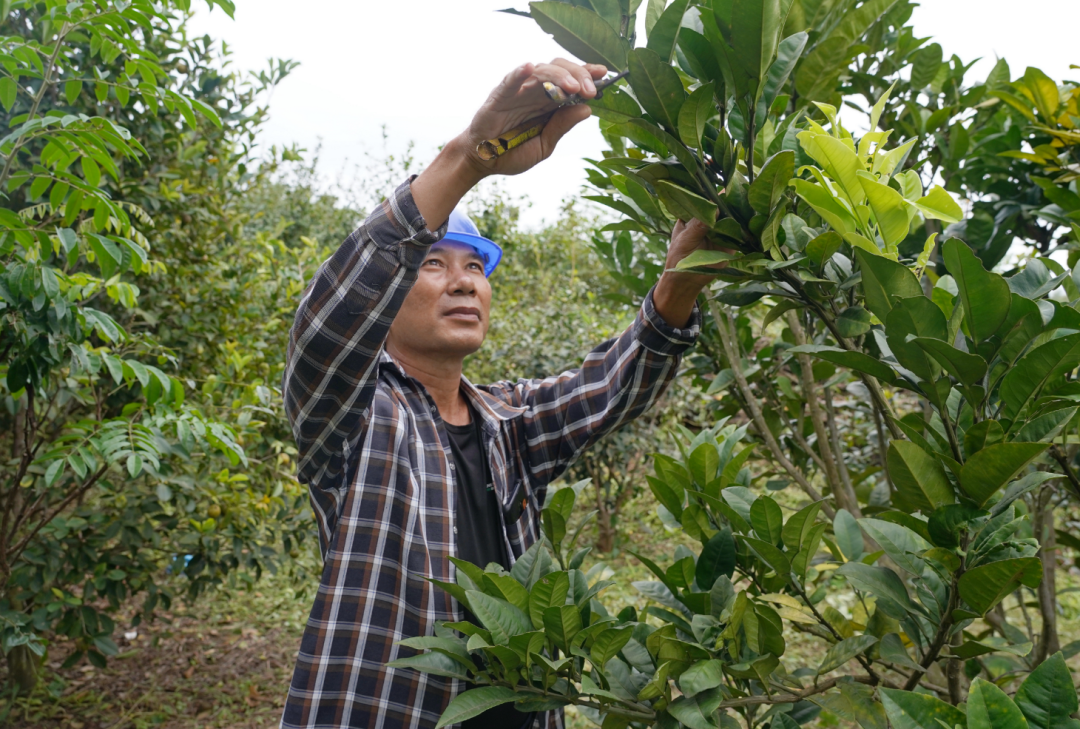 ▲胡永辉正在为化橘红树修理枝干。