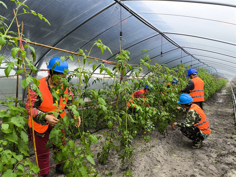 工人们给西红柿固定支架(央广网记者 蔡文娟 摄)