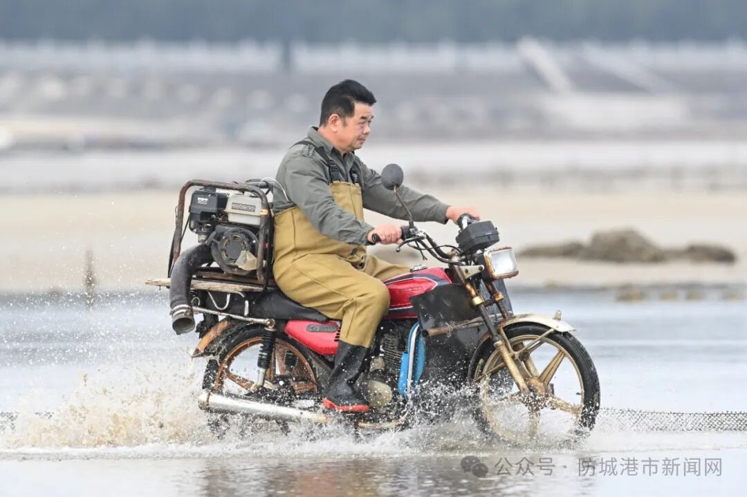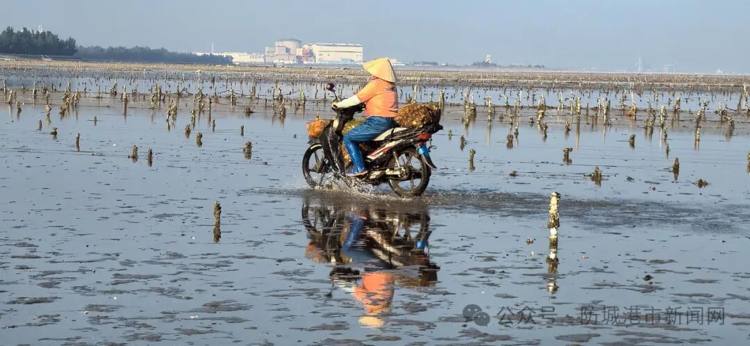 1月17日,天气晴好,暖阳如春。下午四时许,当潮位退至3米左右,港口区光坡镇沙螺寮村村民老苏和妻子便拿上挖螺工具、骑上摩托车,向他们家的浅海“螺塘”驶去,开始又一番的收螺作业。