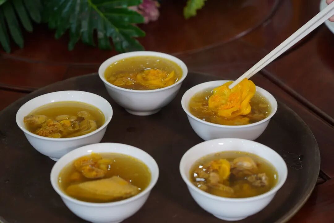 金花茶鸡汤——将防城港的特色金花茶与鸡汤相结合,不仅能让味蕾得到满足,还能让身体得到很好的滋养。让我们跟随镜头一同前往广西金花茶酒店管理有限公司(华业城酒店)品尝这道跨界组合吧。